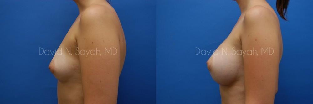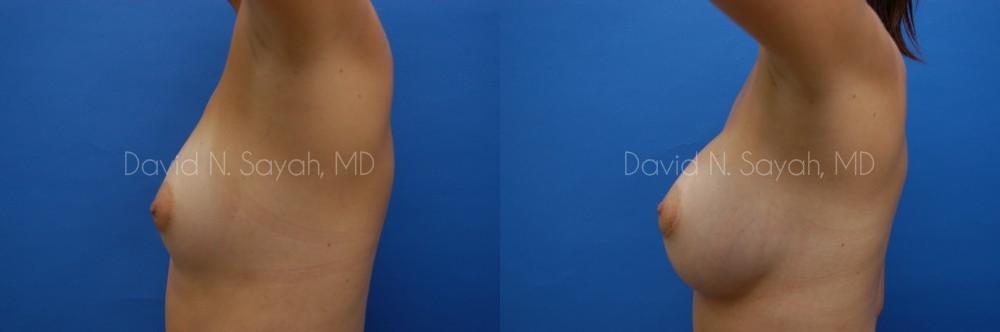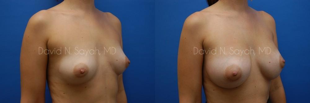 During her consultation with Dr. David Sayah, he asked the patient to describe her idea of perfect breasts. He explained that often times one person’s perception of the D-cup breasts seen in pictures may or may not be based entirely on size. He explained that implant profile and placement will contribute to the overall outcome of the surgery and asked that the patient bring in photos of breasts that she appreciated. After reviewing photos and discussing different size and material options the patient chose 450cc smooth round silicone implants to be inserted through incisions made around the nipples and placed beneath the breast muscle.