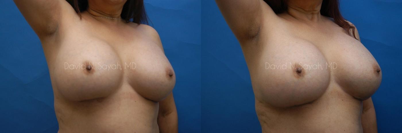 Patient had pain and hardness in breasts due to an augmentation performed by another surgeon several years prior. Dr. Sayah performed an implant exchange and capsulectomy to remove the painful scar tissue. This patient wished to maintain her current size but address the flattening near the scar on the right breast.