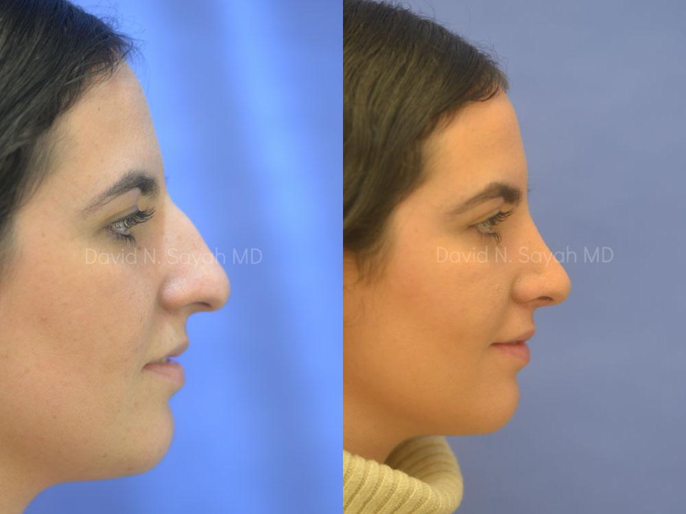 The patient is a 19-year-old female who presented to our office with difficulty breathing and a cosmetic concern for a large dorsal hump and a droopy tip. She underwent rhinoplasty, septoplasty, and turbinoplasty and achieved a more refined nose through which she can breathe better. Her nostrils were narrowed with a novel technique developed by Dr. Sayah which does not result in any scarring.